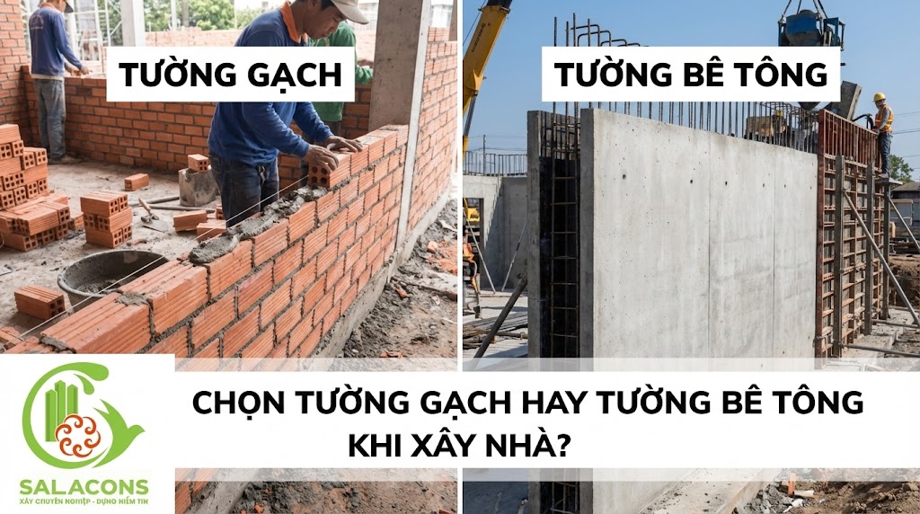 Chọn tường gạch hay tường bê tông khi xây nhà là câu hỏi khiến nhiều gia chủ băn khoăn ngay từ giai đoạn lên ý tưởng. Mỗi loại tường đều có ưu điểm và hạn chế riêng, ảnh hưởng trực tiếp đến chi phí, độ bền, khả năng cách nhiệt – cách âm và cả việc sửa chữa, nâng tầng về sau. Trong bài viết này, SalaCons sẽ phân tích chuyên sâu, dễ hiểu, giúp bạn lựa chọn giải pháp phù hợp nhất với nhu cầu sử dụng, quy mô công trình và kế hoạch lâu dài của gia đình.
