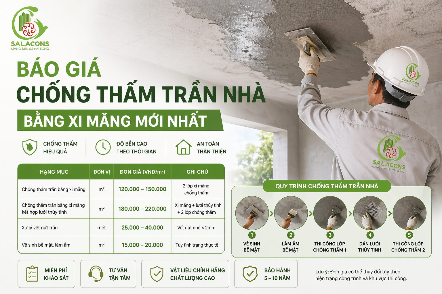 Với đội ngũ kỹ thuật có kinh nghiệm, SalaCons thực hiện đầy đủ quy trình chống thấm trần nhà bằng xi măng, từ khảo sát, tư vấn giải pháp đến thi công và bảo hành. Nhờ đó, công trình không chỉ được xử lý triệt để mà còn đảm bảo độ bền lâu dài.