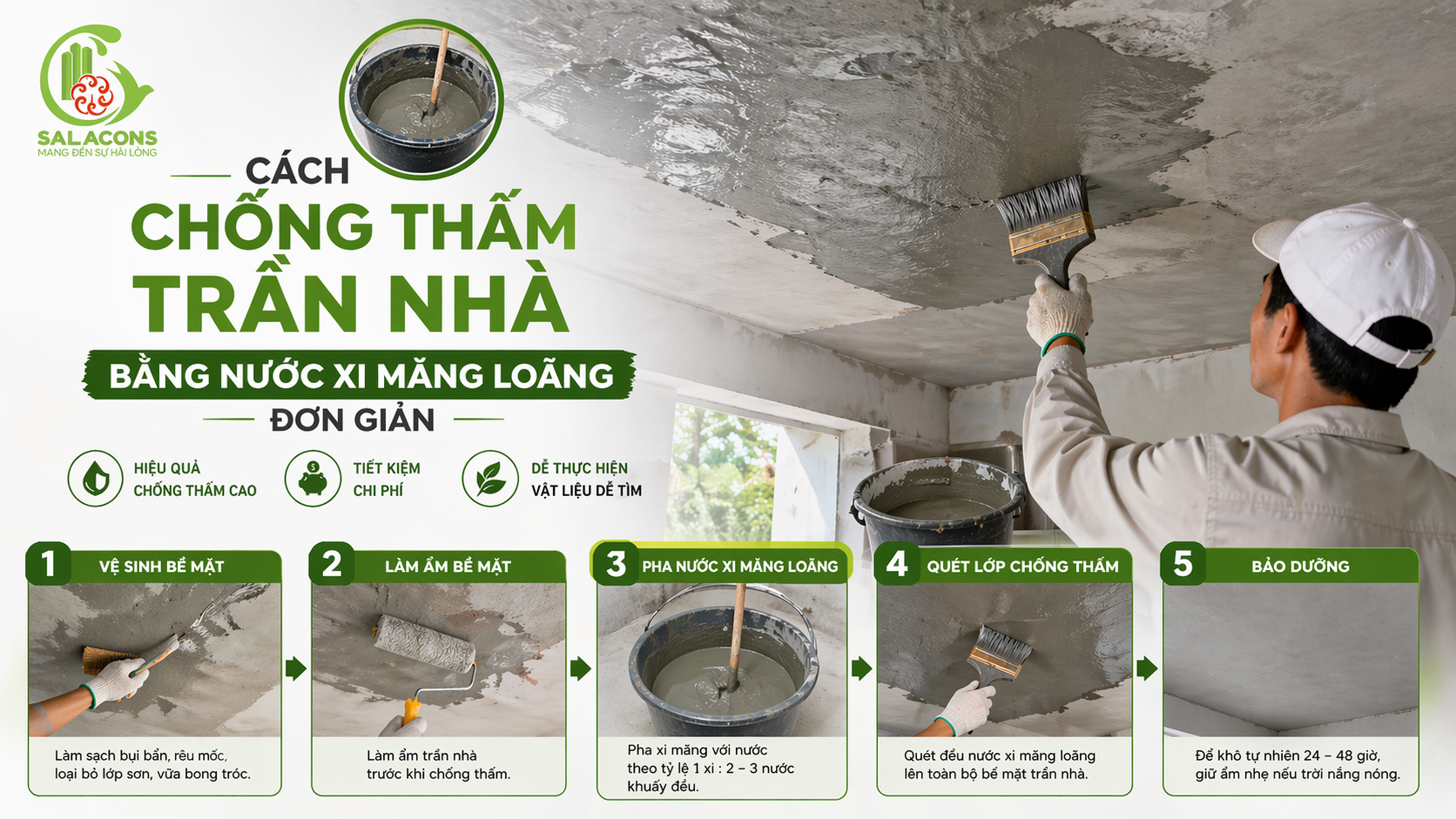 Cách thực hiện gồm: trộn xi măng với phụ gia theo đúng tỷ lệ của nhà sản xuất, sau đó thi công lên bề mặt trần đã được xử lý sạch và làm ẩm nhẹ. Thường sẽ cần phủ từ 2–3 lớp để đạt hiệu quả tối ưu.