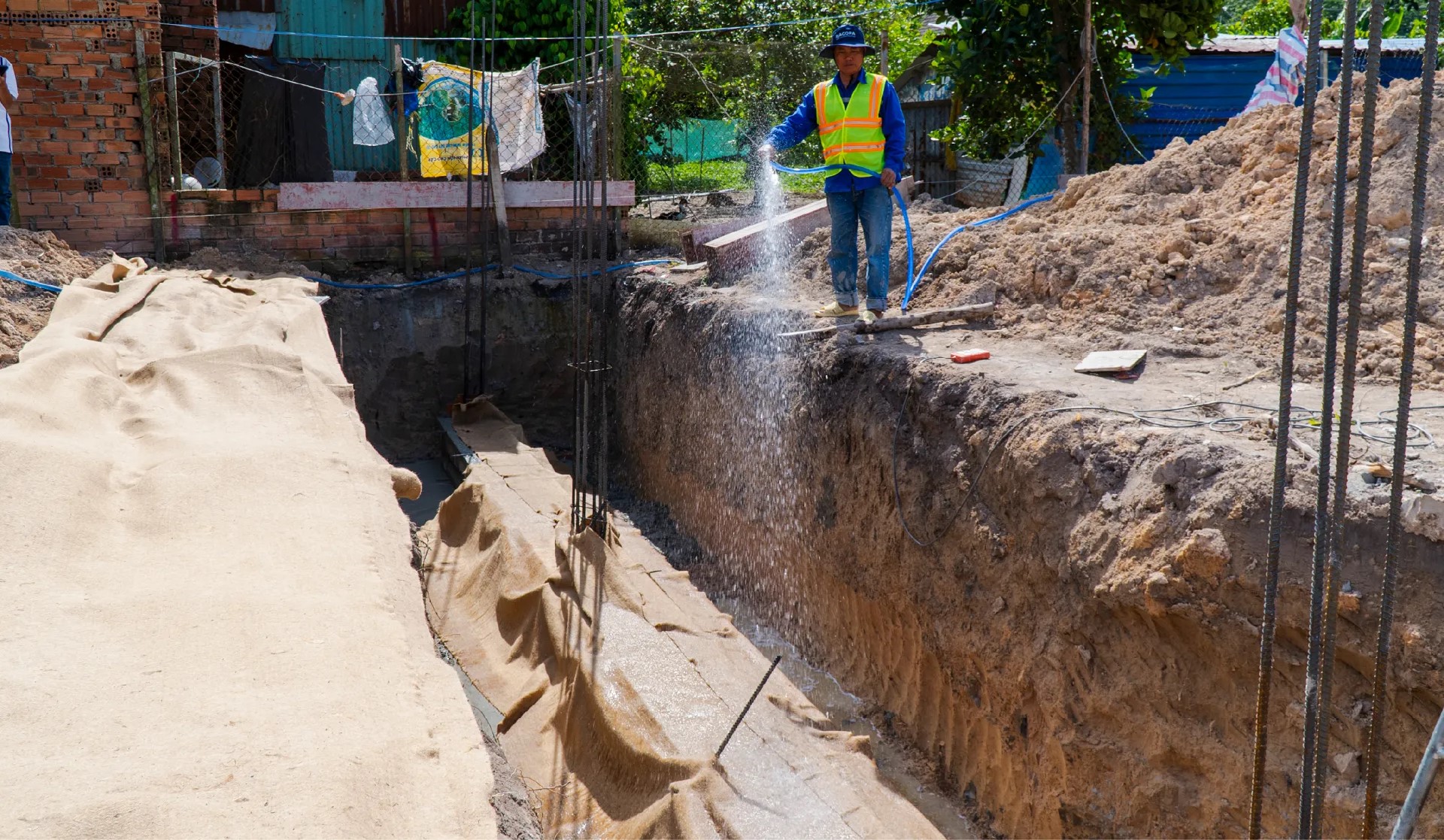 Một phương án khác là phủ bao tải ướt, vải địa kỹ thuật hoặc lớp cát ẩm lên bề mặt móng. Lớp phủ này giúp giữ nước lâu hơn, hạn chế bay hơi nhanh dưới tác động của nắng và gió. Phương pháp này đặc biệt hiệu quả trong điều kiện thời tiết khô nóng, giúp duy trì môi trường thuận lợi cho quá trình thủy hóa.